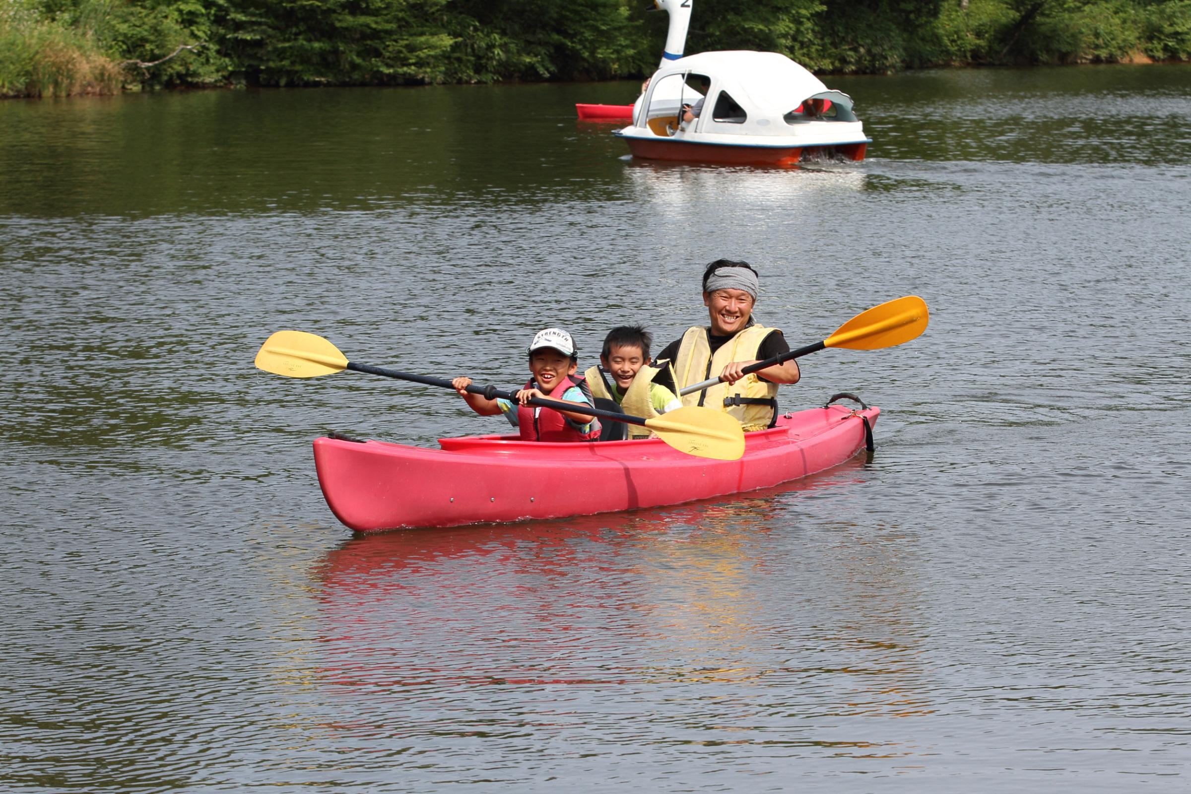 茶臼山高原に広がる矢筈池でカヌー体験をすることができます。インストラクターからレクチャーを受けたらいざ出発!スワンボートもあるのでカヌーが苦手な方もOK。